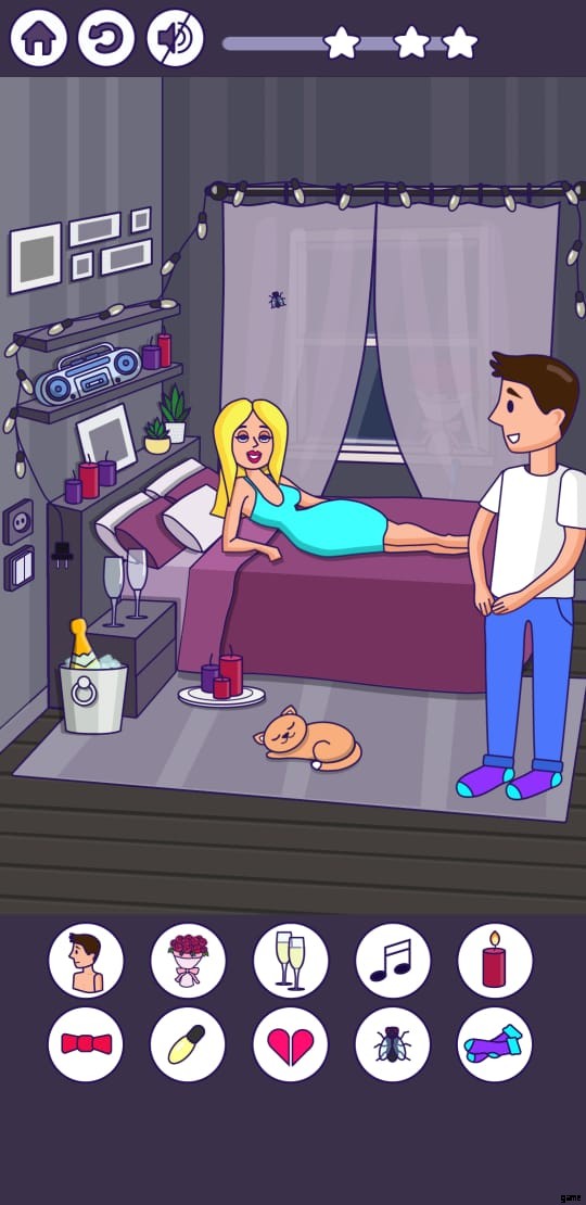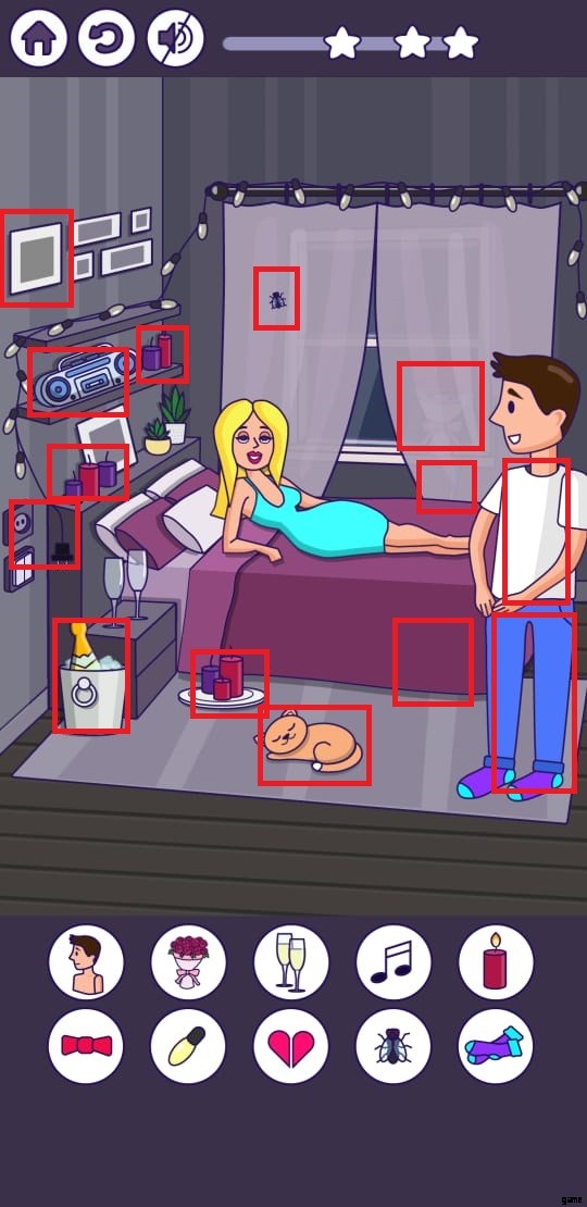 部屋に入ると、美しい女性があなたを待っています。あなたの最終的な目標は、メガネを含む以下のものを見つけることです 、靴下 、ハチ 、ろうそく 、音楽 注意 、壊れた ハート 、その他。