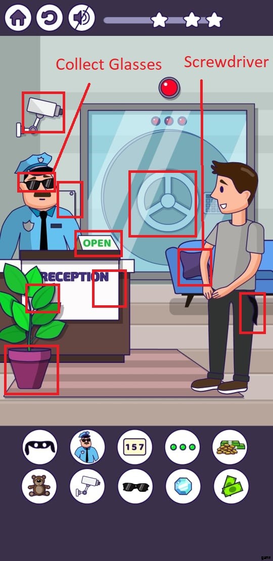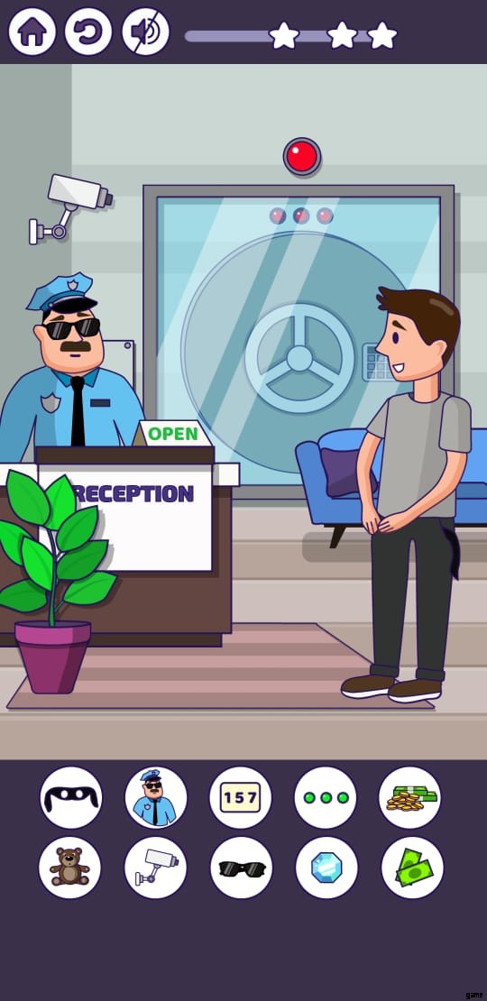 Brain Puzzle Level 4 では、キャラクターは非常に汚れていました。彼をきれいな服でドレスアップした後、ゲームは脳パズルレベル 5 のロックを解除します。これは、10 個の隠されたオブジェクトを見つけることを目標とする銀行で行われます。レベルが始まると、キャラクターが受付係の前に立っています。泥棒を監視するために防犯カメラが設置されているので、急ぐ必要はありません。