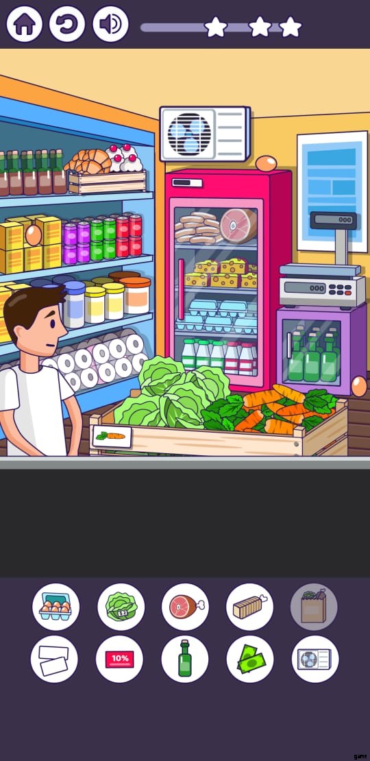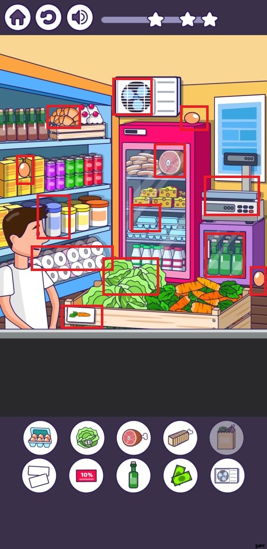 脳のパズル 食料品店に行き、そこで 10 個の隠されたオブジェクトを見つけることが究極の仕事です。アイテムがどこに保管されているかは誰にもわかりません。発見できるのは探偵の目だけです。したがって、ツールはありませんが、探偵のように行動する必要があります。エリアを深く調査し、オブジェクトと対話し、リストを完成させるために必要なものを見つけます。パフォーマンスに応じて 1 つから 3 つの星を獲得できるスター報酬システムを備えています。