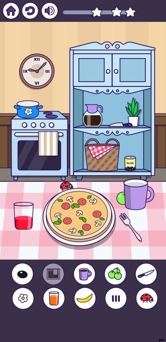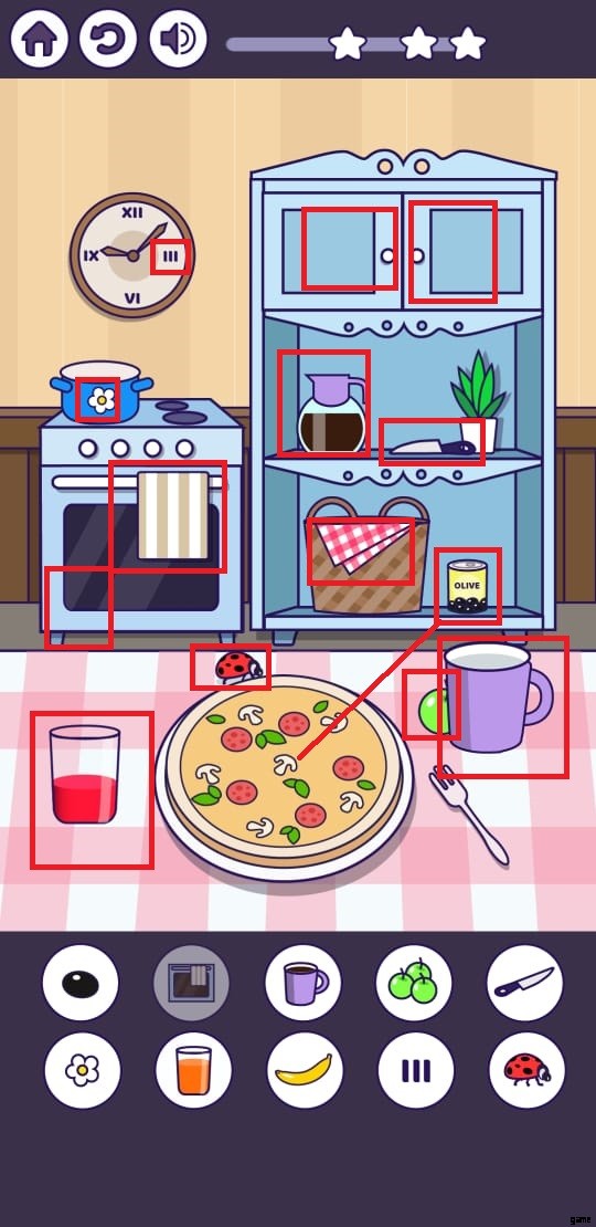 - ピザにドラッグする必要があるオリーブの箱があります。その次に、ピザをオーブンに持ってきて閉じて、最後のアイテムを見つけます。
