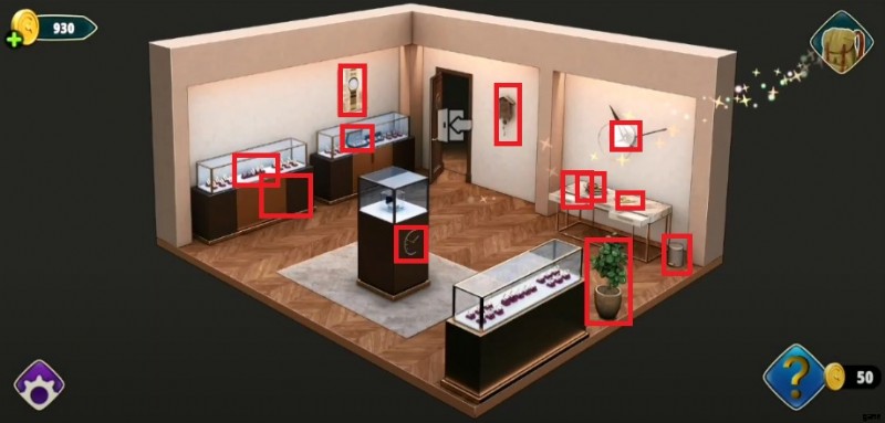 宝石を配置した後、別のスタンドとカウンターがある 2 番目の部屋に移動する必要があります。あなたのアルティメットも同じです – 隠されたオブジェクトを見つけてトリッキーなパズルを解いてください.