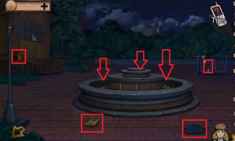 探偵の画像をクリックするだけでキャラクターを変更し、ロッカーが入った箱を発見した噴水にたどり着きます。