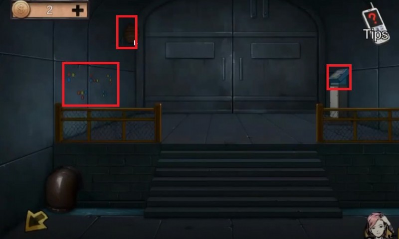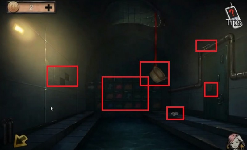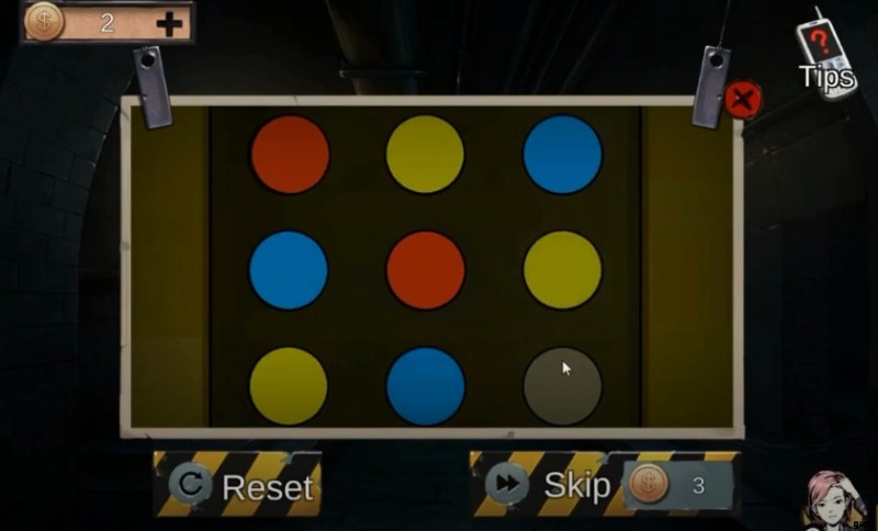- 左の壁をタップしてさまざまな色の円を数え、次の下水道ラインにある黄色のボックスに向かいます。画像のように色を設定してボックスを開き、メーカー ボックスからキーを取得します。