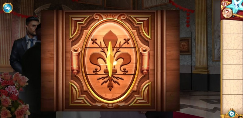 - 次に、右側にある花をタップしてテーブルを脇に移動し、警備員のシャツに見たエンブレムを描いてみてください。 2 ハーフ エンブレムは女の子のシャツにあります。