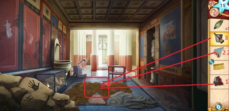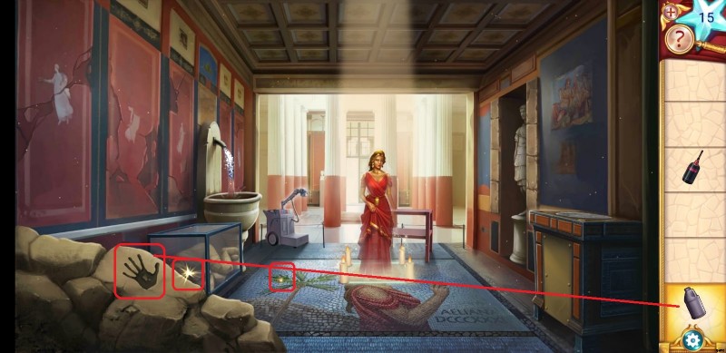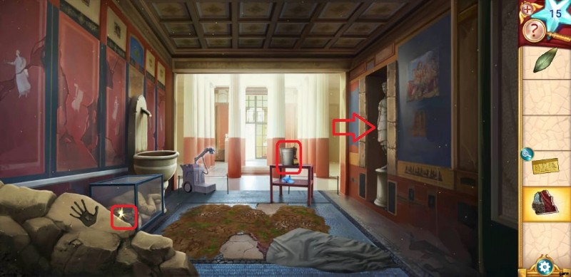 - 石膏ボトルを使って石から右手を取り出し、テーブルの右側にある彫像に固定して金色のボールを手に入れます。2 つ目のボールは モザイク に落ちています> .