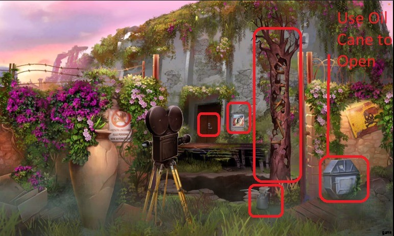 - 錆びた木の近くから油杖を集めて、ゴミ箱に入れます。ゴミ箱をクリックして鍵を入手し、錆びた木をタップしてドアへの道を作ってください。
