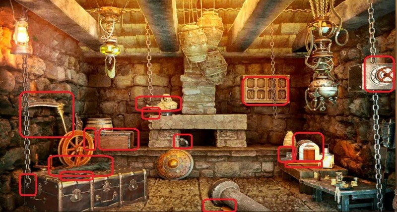 - 箱の近くから見つけたブロックに液体を入れてフックを作ります チェーンで接続し、ハンドルを回転させて引き上げ、脱出方法を解明する必要があります。