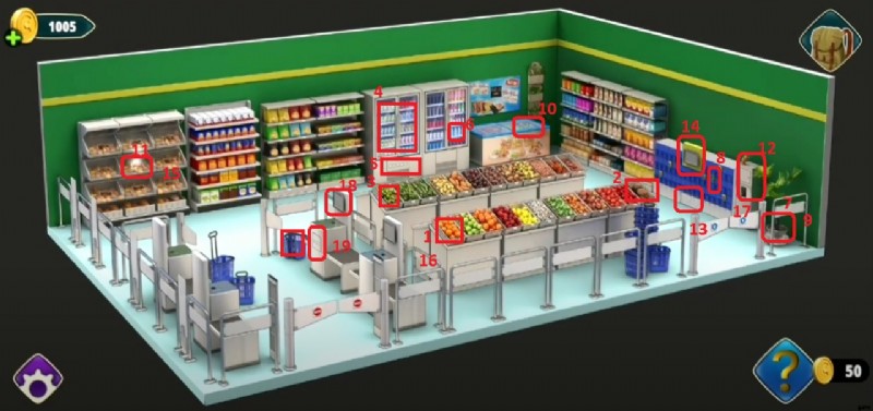 部屋と出口 レベル 18 は食料品店で行われ、そこにはいくつかの屋台があり、隠されたオブジェクトとやり取りしたり見つけたりすることができます。これは、高品質のグラフィックスと優れたメカニズムを備えた最高の隠しオブジェクト ゲームの 1 つです。直感的なコントロールを使用して、非表示のアイテムをタップするだけで、バッグ (インベントリとも呼ばれます) に自動的に追加されます。さらに、クリックしてバッグを開くと、[使用] などの 4 つのボタンが表示されます。 、組み合わせる 、解体 、そして調べる .ドライバーを集めた場合は、インベントリを開いてバッグの中から選択して使用する必要があります。そうしないと、パズルを完成させるために使用されません。食料品店のレベルを完了しておらず、少し混乱している場合は、レベル 18 の部屋と出口のチュートリアルをお読みください。 解決策を見つけます。