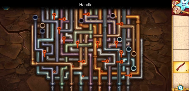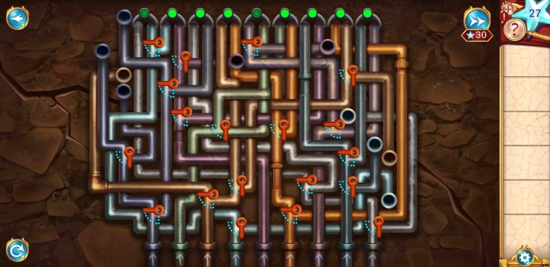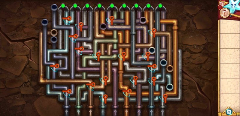パイプ パズルには 2 つの部分があります。最初のものは非常に簡単で、数回タップするだけで完了します。まず、いくつかのパイプを止めて水の流れを止めなければなりません。