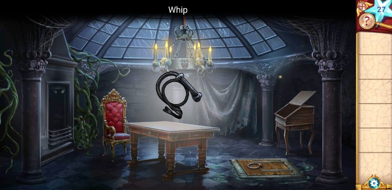 - テーブルと椅子はどちらも上下逆さまになっているので、適切な位置に持ってきて、ワードローブを開いてムチを集めてください。