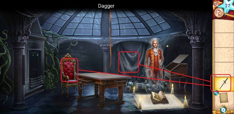 - Use a dagger to remove the cloth from the front wall to collect a blade and the red chair to collect the chemical jar.