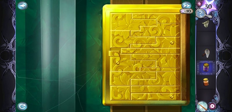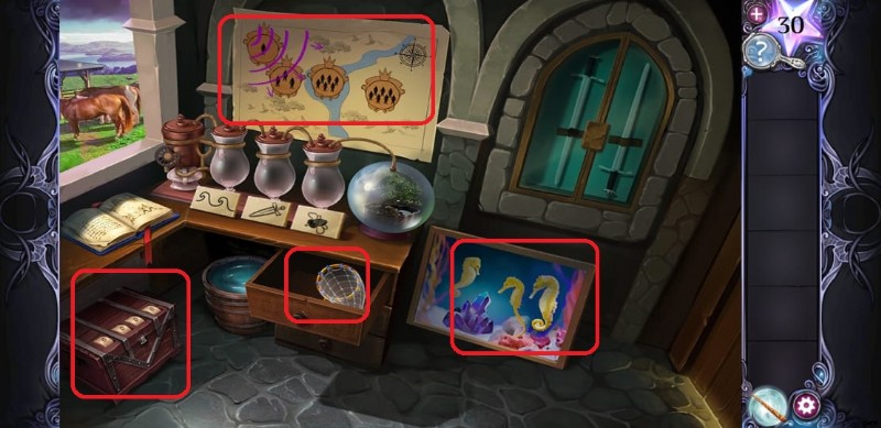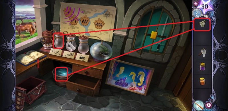- 本棚と食器棚の間に置かれたグラスに向かい、丸い宝石を置いてから、開いた本で見た道をたどってミニゲームを始めましょう。