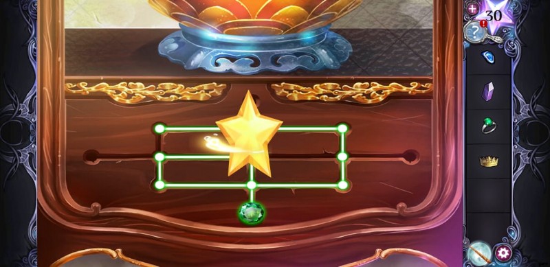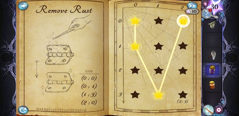 - 上記のアイテムをすべて集めたら、魔法書をタップします テーブルの宝箱の上で利用可能になり、指をドラッグします 画像の下に示されているように、持ち上げずに星を適切な組み合わせで接続します。