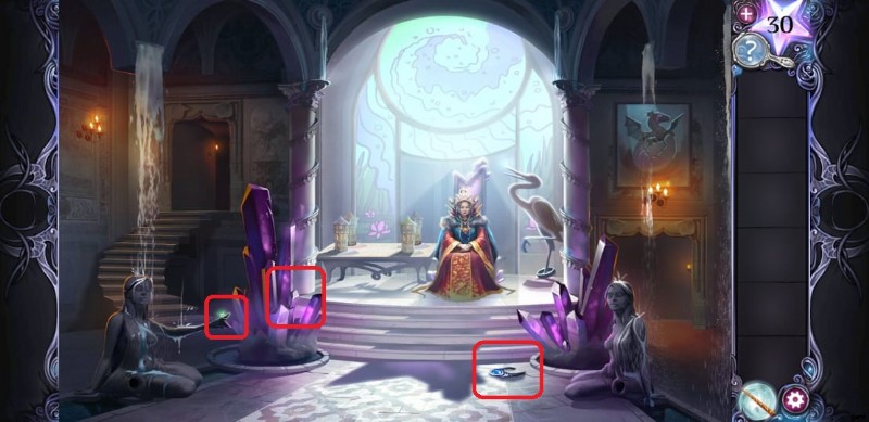 - 女王の左側にあるテーブルをクリックし、呪文を使ってさびを取り除きます。その後、色に応じて宝石をディスクに移動するだけでパズルを解いてみてください。