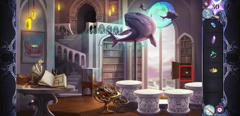 - 右側に、図書室のような新しい部屋につながる通路があります。そこにたどり着いたら、食器棚の王冠やキャビネットの緑の宝石などのアイテムを集め始めます。