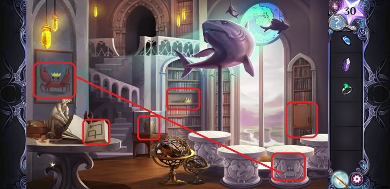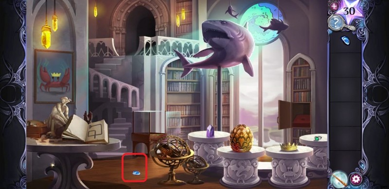 - 確認後、ライブラリーに戻って、次のアイテム(卵、王冠、クリスタル、リングなど)を正確な台座に配置する必要があります。完了すると、サメがお守りの後半をドロップする場合があります。