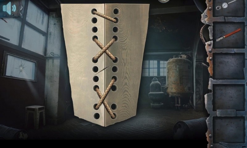 - 最初の部屋に行き、壊れた窓の下にテーブルを置き、上着に見られたデザインに従ってロープを使ってテーブルの脚をすべて結びます。