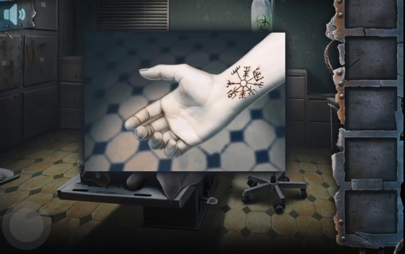- 間もなく、死体の手が開くかもしれません。あなたは鍵を集めなければなりません。酸素ボンベの横にあるドアを開けるためにエリアを離れますが、身体の右手に描かれたタトゥーを見ることを忘れないでください。