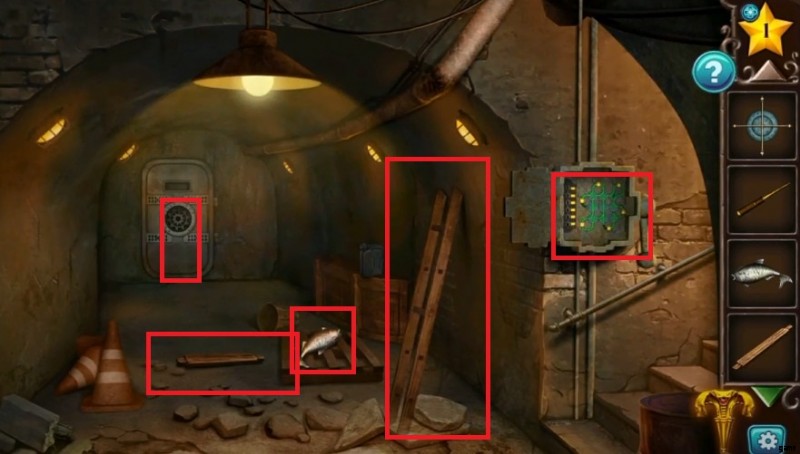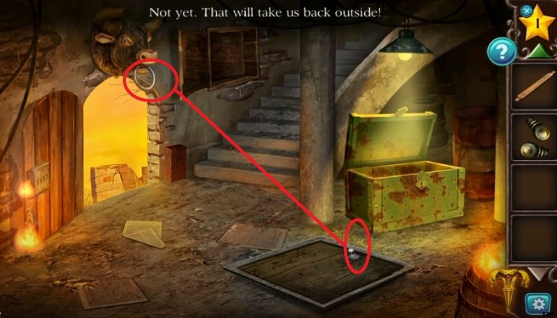 - ドアハンドルを使ってトラップドアを開き、地下室に入ります。目的はインベントリからレバーハンドルを選択し、それを回路ボックスに接続することです.