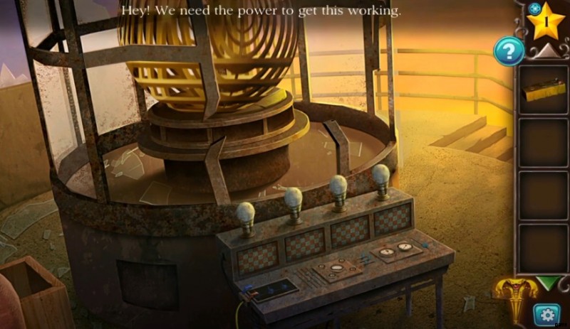 ドアが開くと、電球が 2 つなくなった新しいマシンの前にいることに気づきます。部屋から 2 つの電球を集めたので、インベントリからそれらを選択して、そこに固定してください。