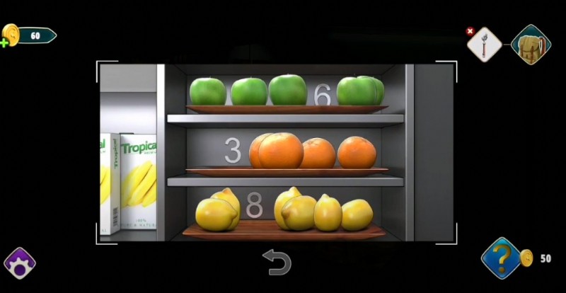 - すべての引き出しのロックを解除したら、カウンターに行って果物を見つけ、それらを 1 つずつ脇に置いて、638 になる 3 つの数字を見つけます .