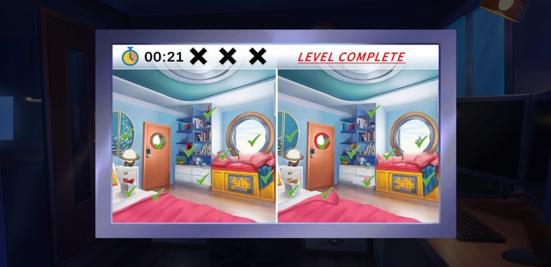 - 2 番目のパズルでは、10 個の違いを見つける必要があります 50 秒以内 3ターンしかありません。今回のゲームでは、同じ寝室の 2 つの画像が表示され、多くの家具やその他のオブジェクトが見つかる可能性があります。