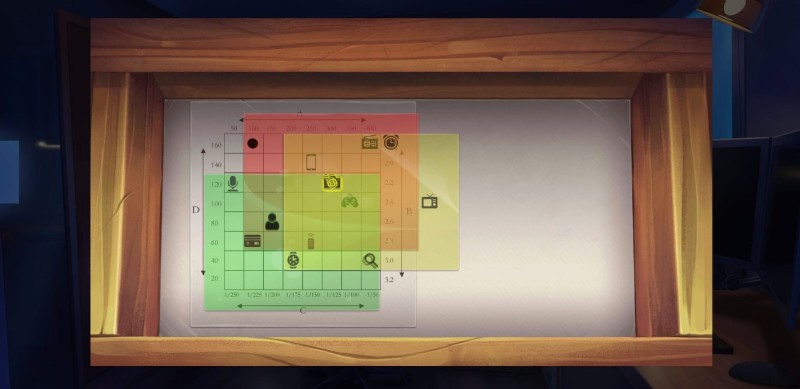 - アイコンの手がかり紙を分析した後、カメラをタップしてパズルを解いてください .次のパラメータを設定します (A-300 、B-2 、C-1/125 、およびD-120 ) パズルを解いてメモリー カードを集めます。