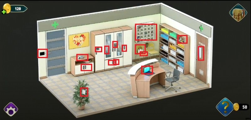 携帯電話店を脱出した後、たくさんの薬が入手できる薬局店に閉じ込められていることに気付くかもしれません。ゲームには、ゲームをプレイするときに発見しなければならないオブジェクトのリストはありません。 レベル 29 の部屋と出口から脱出する唯一の方法 オブジェクトを操作して手がかりを発見し、USE などの次のボタンを使用してそれらを分析することです 、組み合わせる 、解体 .