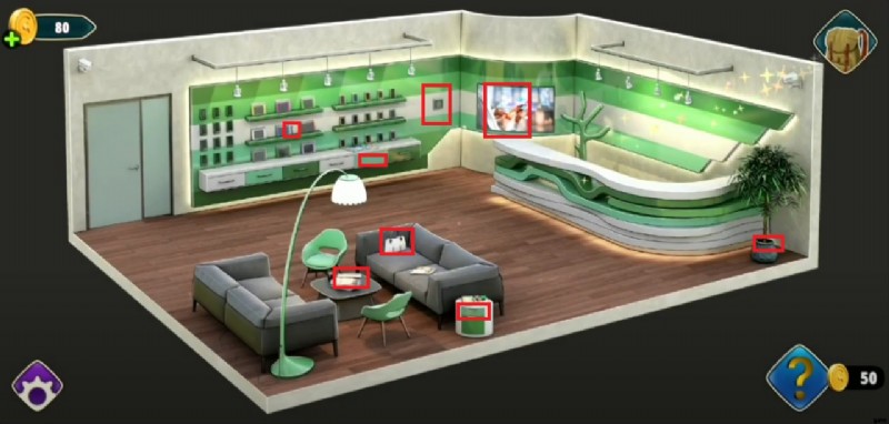 このゲームでは、緑をテーマにした美しいお店に連れて行ってくれます そして素晴らしい家具 .正面の壁にはいくつかの電話があります。その間、カウンターとショーケースの間に LED があります。