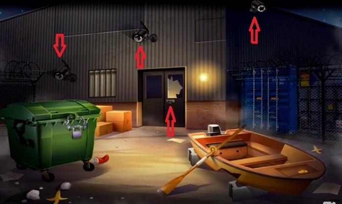 - カメラを損傷した後 、セメントレンガを使用 不気味な倉庫にアクセスするには、ドアをいくつかの部分に引き裂きます。 .