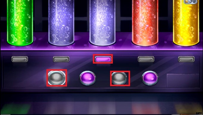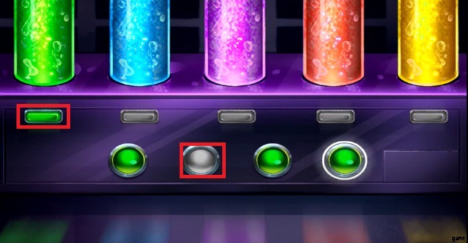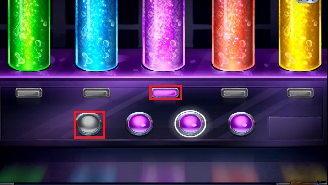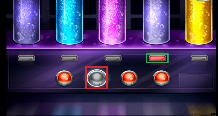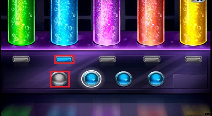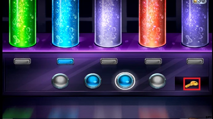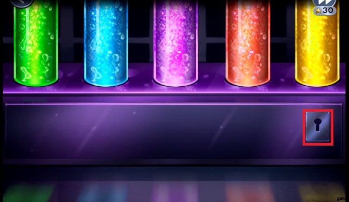 - 右側に、異なる色の液体が入った 5 本のボトルがあります。インベントリからキーを選択し、キーを使用してロックを解除してください。