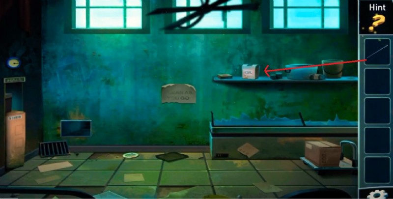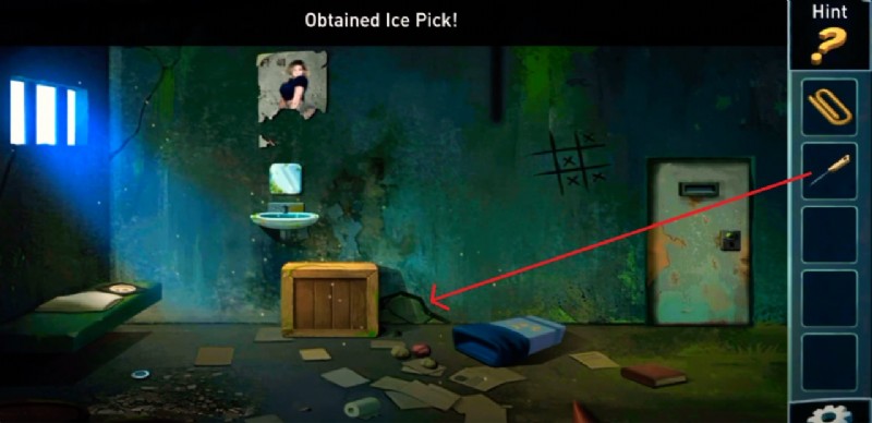 - 箱をタップして脇に置き、インベントリからナイフを選択して、アイスピックを使って壁を掘り、フックを入手します。 .