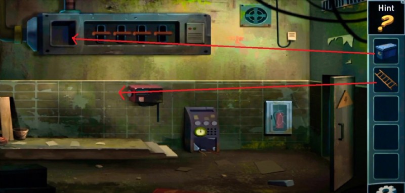 - ドアの近くにあるはしごを選択し、インベントリに保管します。キャビネットを開けてそこからバッテリーを取り出してください。