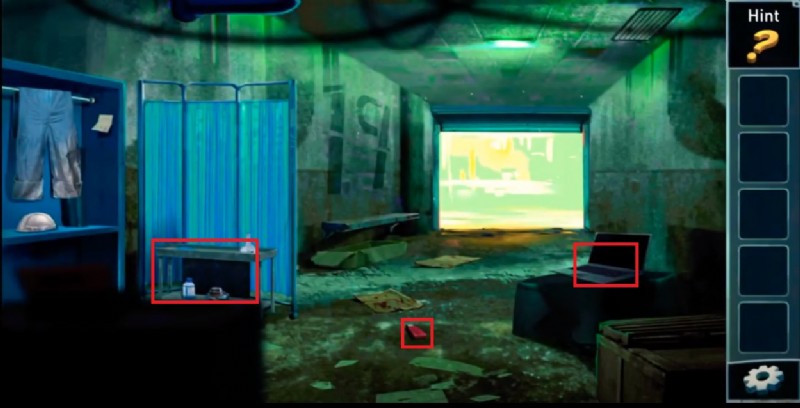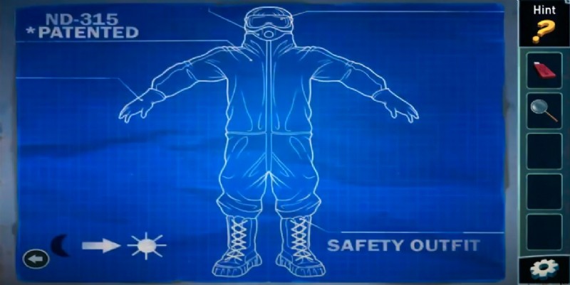 - 左側にある食器棚に向かい、拡大鏡、右のブーツ、左のブーツ、左の手袋、スーツ、手術用マスク、ゴーグル、右の手袋を入手してください。紙切れを載せた台車があります。紙片を使って画像を完成させ、ラップトップに直面する場所を離れます。