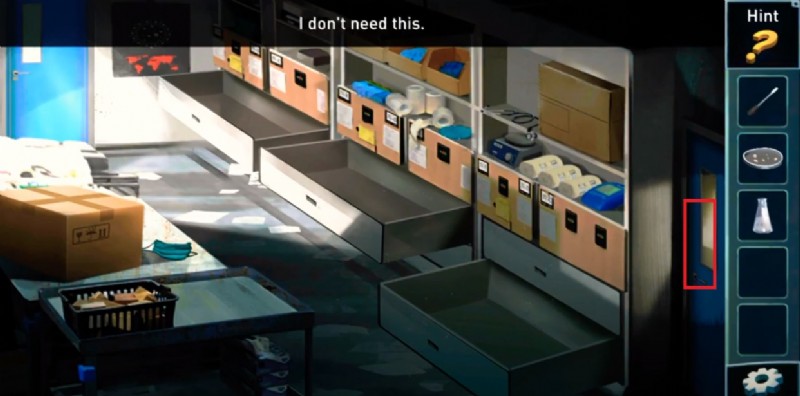 - 研究室の反対側に移動して、テーブルからドライバー、右側の最初の戸棚の引き出しから細菌サンプル、次の戸棚の引き出しから 2 番目の細菌サンプルなど、さらに隠されたオブジェクトを発見します.