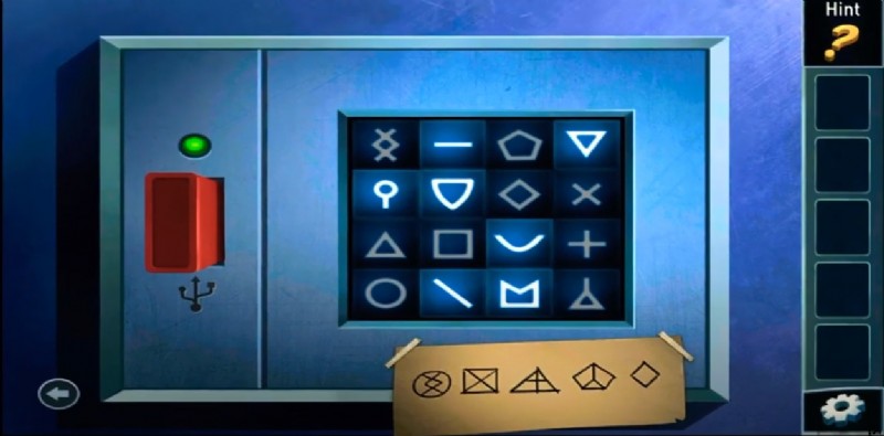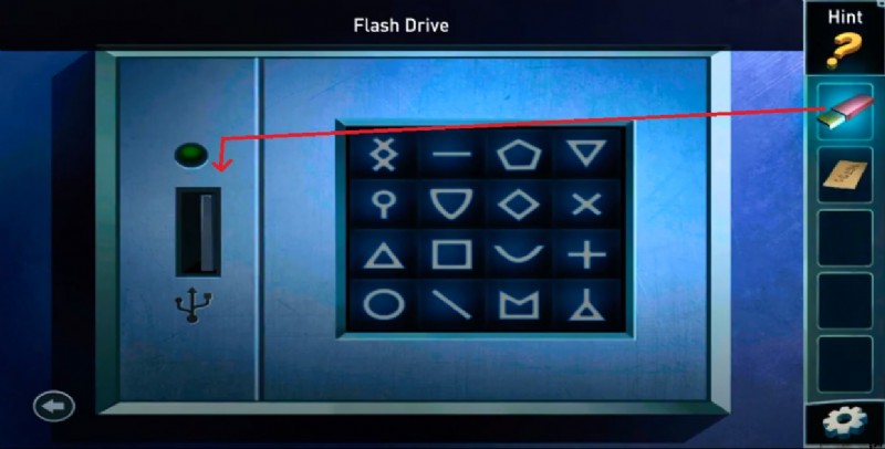 - 最初の部屋に戻り、USB をポートに挿入することを目標とするマシンに向かい、メモにある形に従ってボタンをタップします。