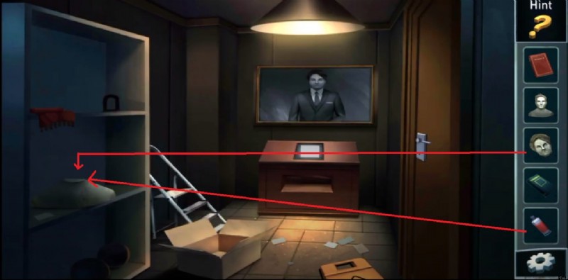 - オフィスから出て、最初の部屋 (物置) に行き、箱から 2 番目の彫像を発見してください。