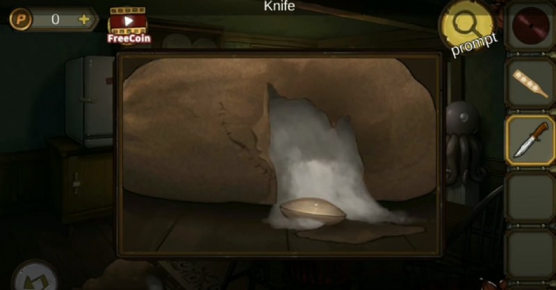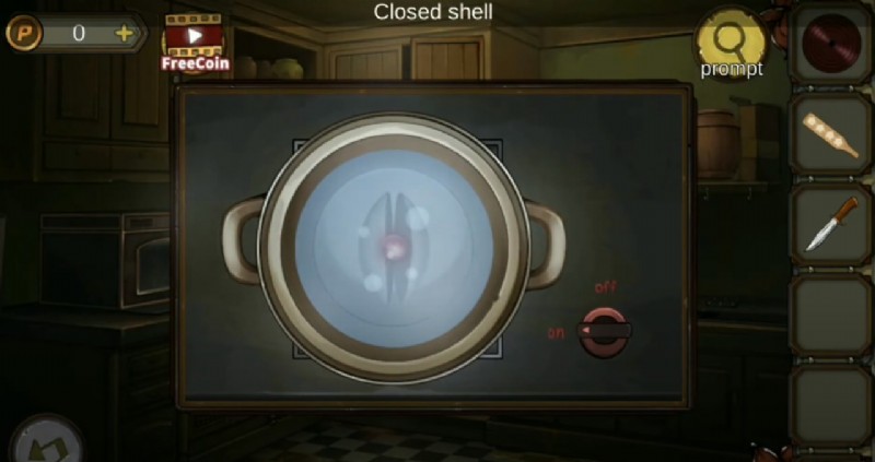 - ダイニング ルームに戻り、ナイフを選択し、床にある袋を切って 閉じた殻 を取得します .