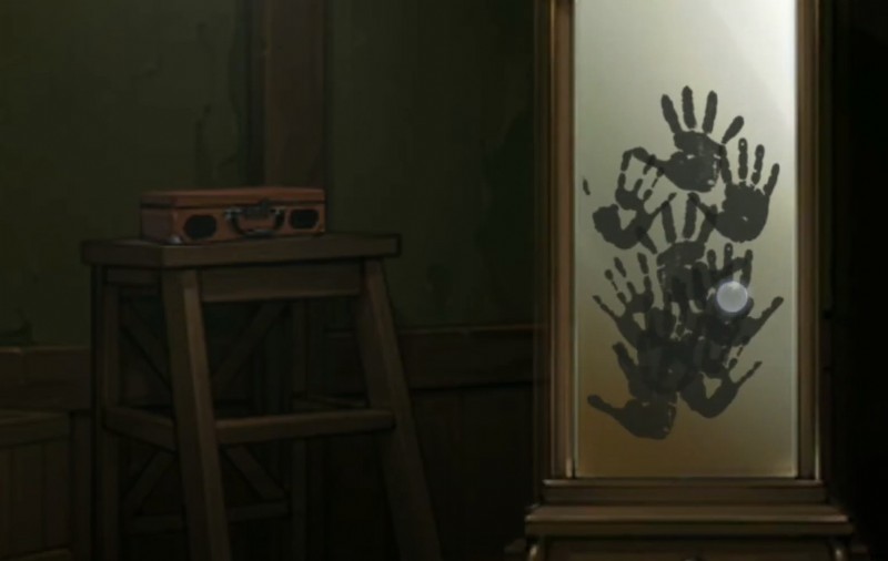 ドアのロックを解除したら、ドアを通り抜けて新しい部屋に行きます。最初の仕事は鏡からカバーを外して手形を調べることです