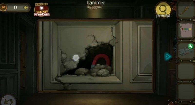 - しばらく部屋を出て、壁の損傷した部分を見つけたら、ハンマーを選択してそこを叩いて磁石を手に入れましょう。