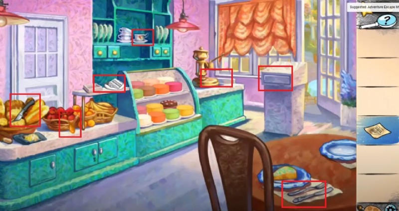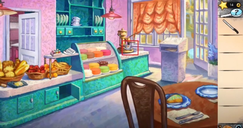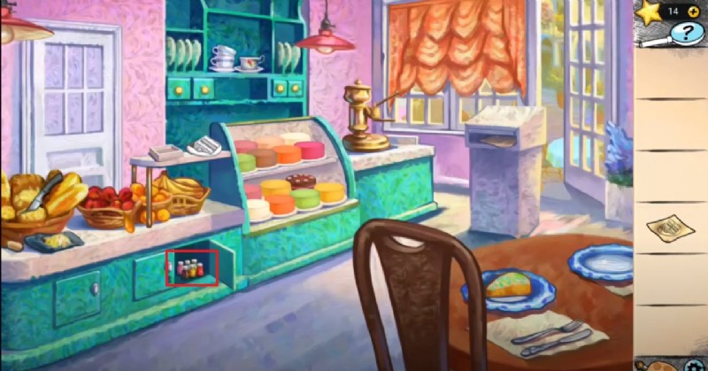 - 窓をタップして緑色のペンキ ドロップを集めます。果物のバケツに向かい、ナイフとオレンジ色のペンキのドロップを集めます。その後、鍵を求めてテーブルに向かい、食器棚から空のカップを手に取ります。