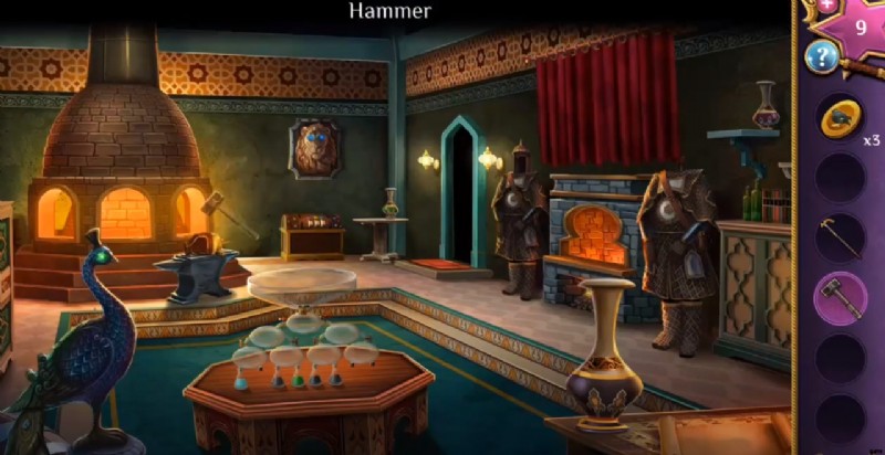 - 暖炉の左側に立っている騎士を見つけて、ハンマーを手に入れましょう。次に、へこんだヘルメットを選択してアンビルに固定し、ハンマーを使用してへこみを修正します。