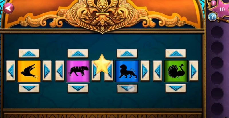 - チェストに戻り、次の順序で動物を設定します:鳥 (黄色) 、タイガー (ピンク) 、ライオン (青) 、孔雀 (緑) .