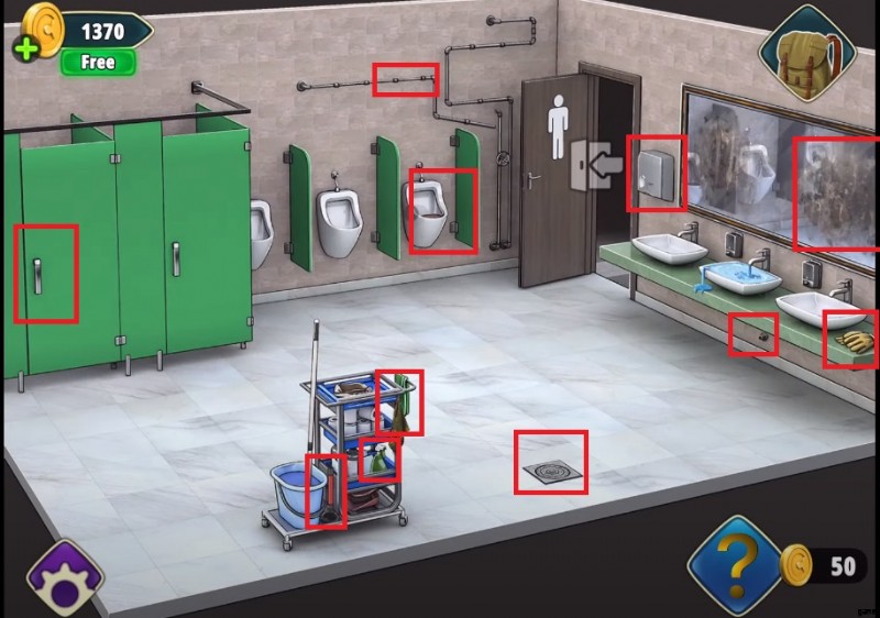 - 戻るボタンを押して調査を開始し、トイレから脱出するための隠されたアイテムと手がかりを見つけてください。