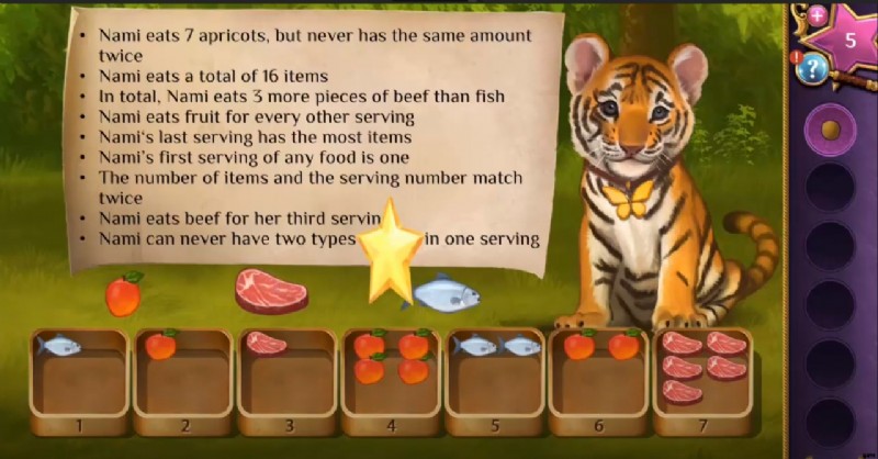その後、トラをタップしてトリッキーなパズルを解きます。ゲームでは、インベントリで利用可能なメモに従って、食べ物を置くための 7 つのトレイが表示されます。パズルを解くには、与えられた手順に従う必要があります: