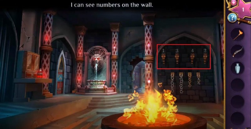 - さて、水の入った花瓶を選び、4 つの松明すべてに水を注ぎ、数字 (1342) を見つけます。 ).