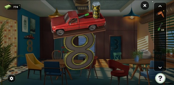Escape from Work レベル 11 は、多くの椅子とソファが用意されたシッティング エリアで行われます。右側にあるテーブルに向かい、タップするとインベントリに追加されるこてを見つけます。こてを選択し、それを使用して粗い壁から塗料を取り除きます。