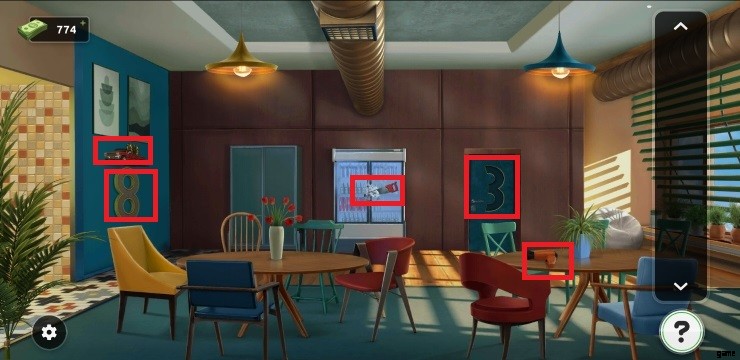 隠しオブジェクトを見つけるのが頭の痛いキッチン エリアにいるようです。たくさんのテーブルと椅子があり、それぞれとやり取りするのは難しいです。そのため、仕事からの脱出ウォークスルー ガイドを読んで助けを求めてください。