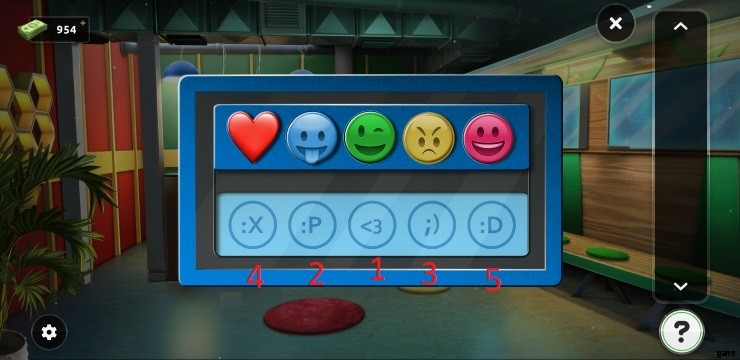 - まず、シーンを調べて、出口ドアの上の緑のスマイル、右の壁の赤い絵文字、床の黄色い絵文字を集めます。