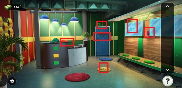 - 受付テーブルに置いてある帽子をタップしてハートを発見し、右の壁の鏡の内側から青い絵文字を集めることを忘れないでください。